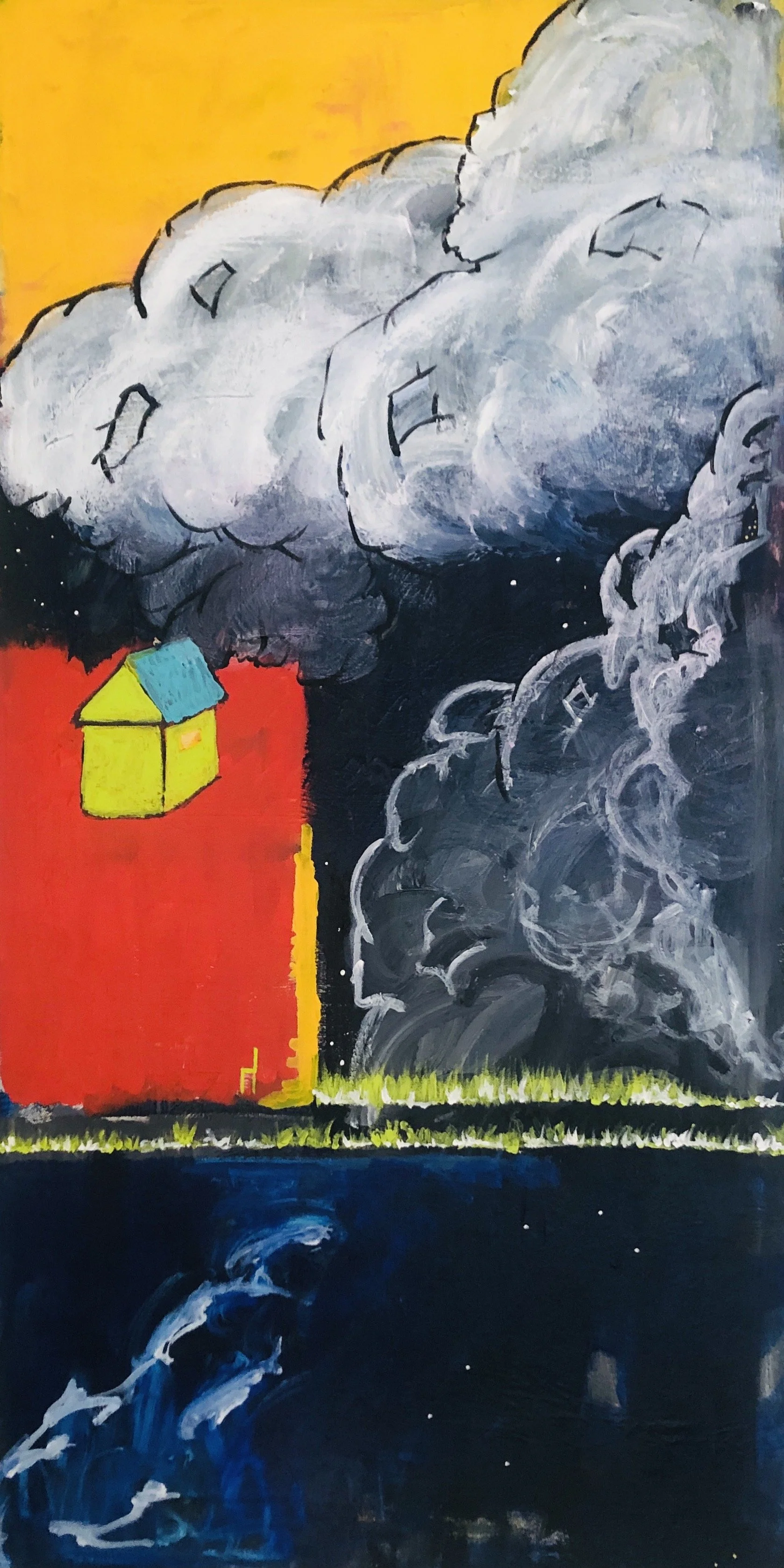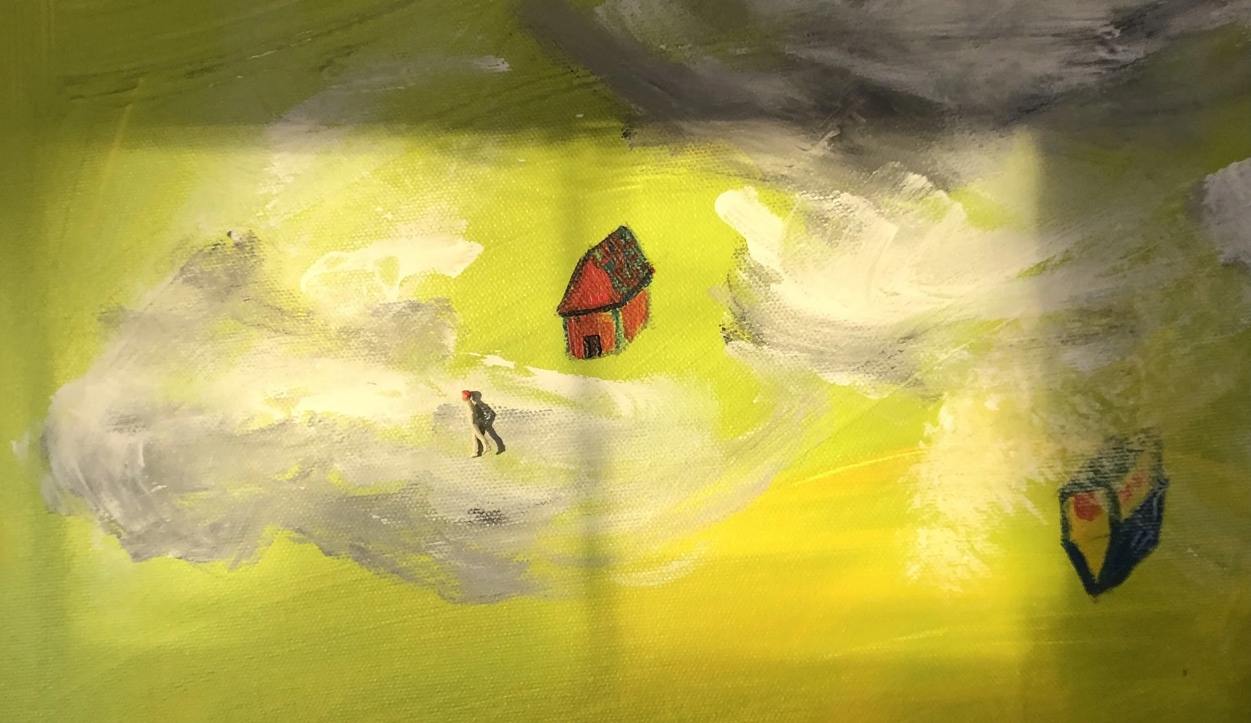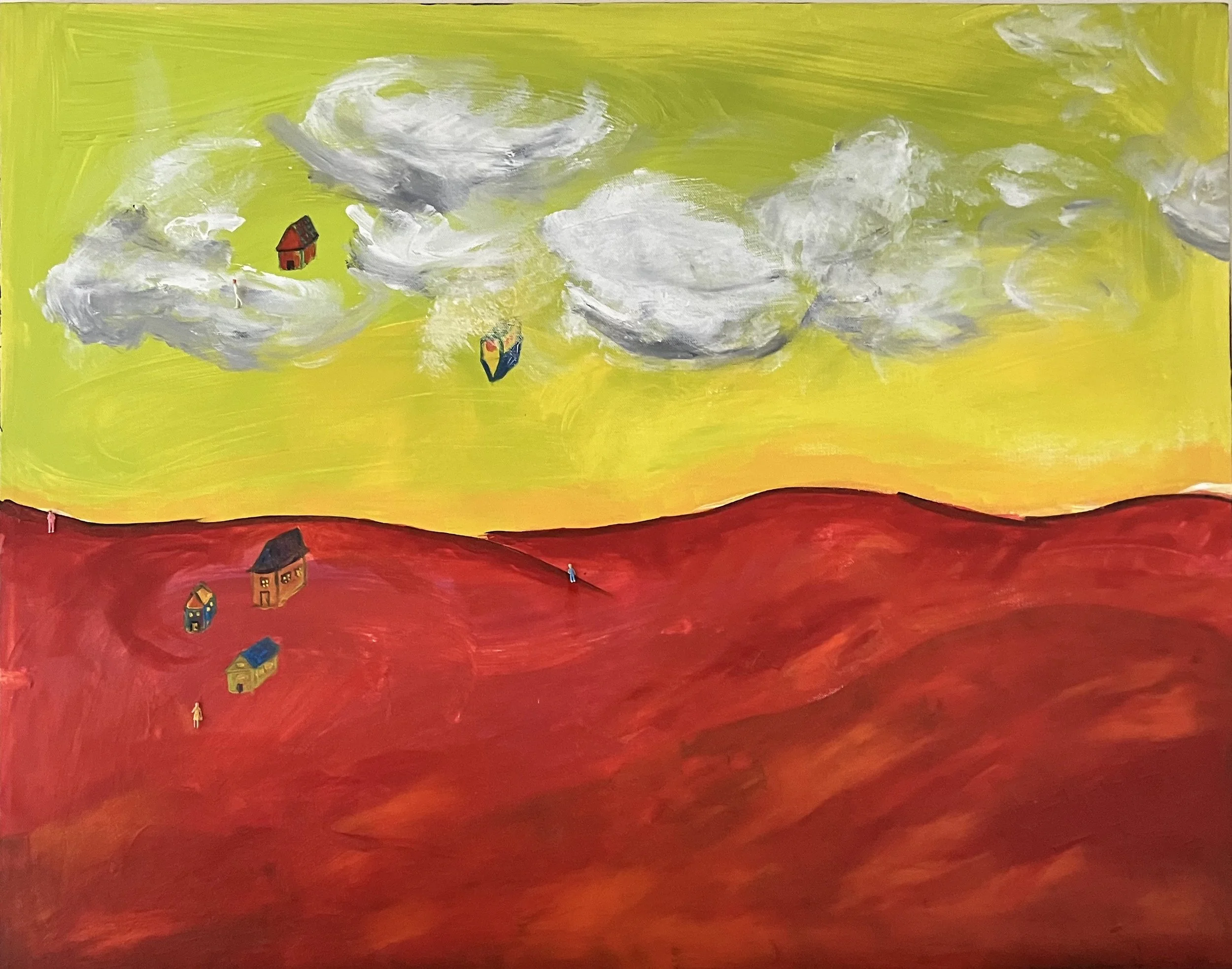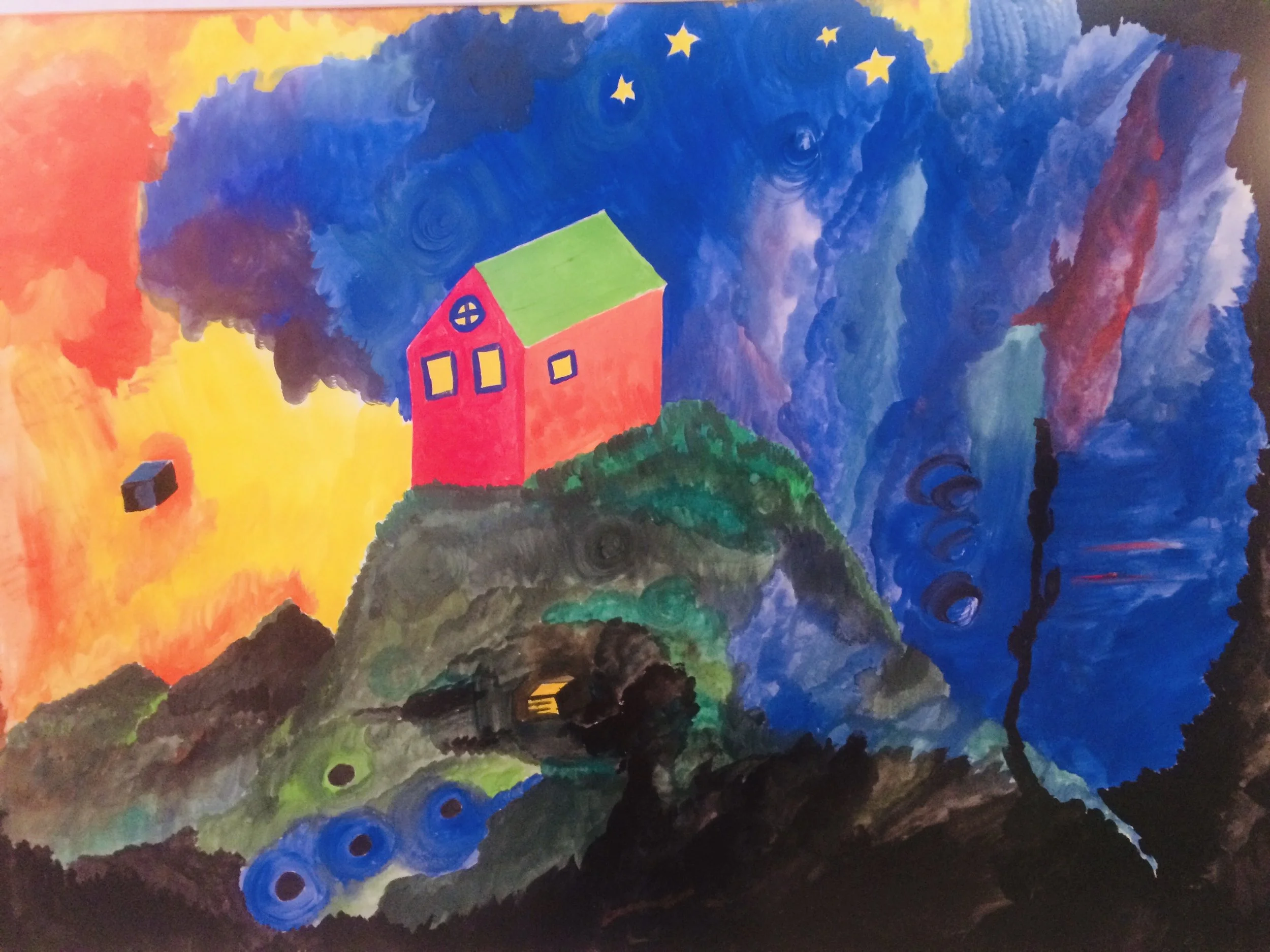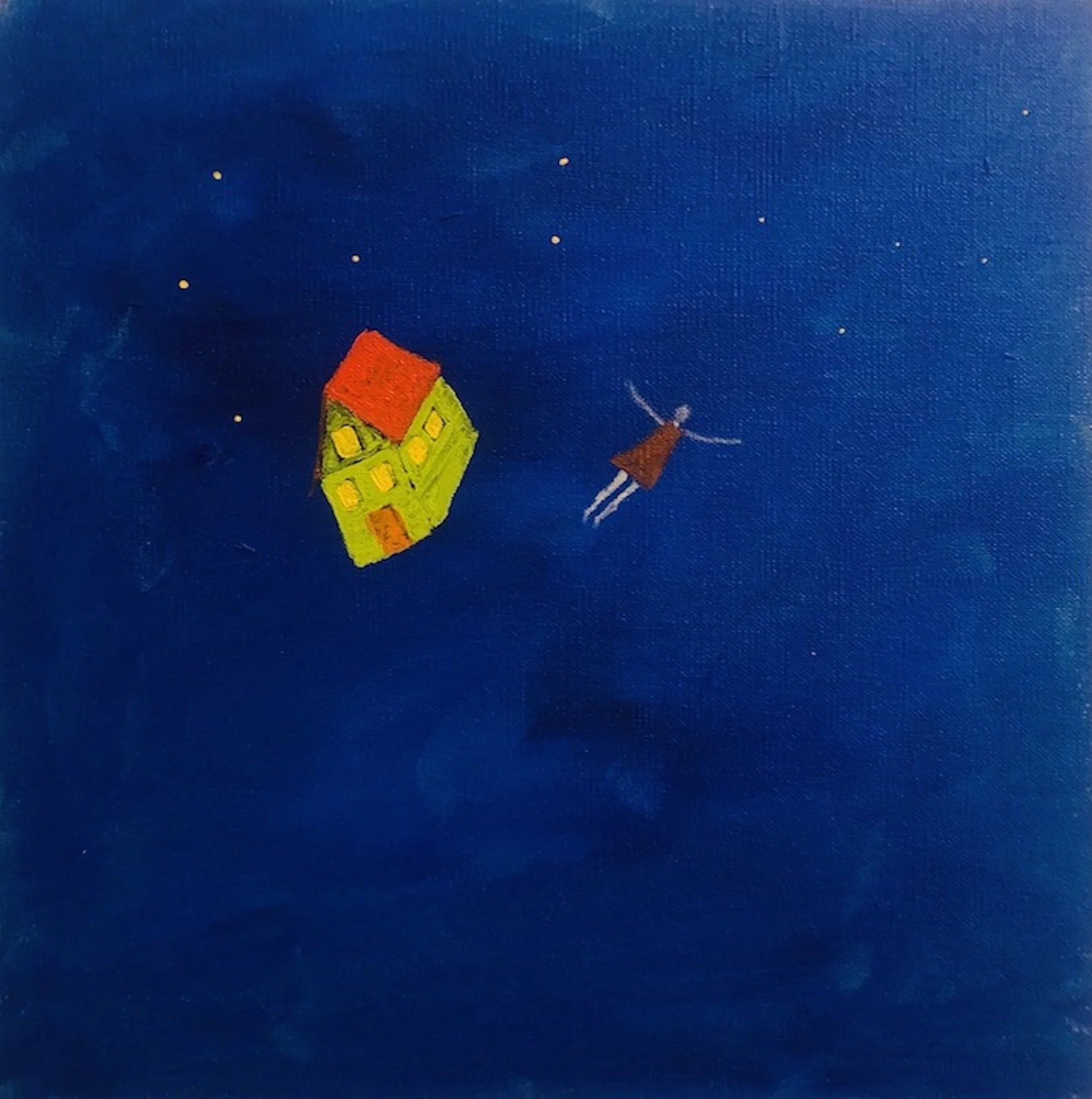 I’m having trouble with a title for the painting to the right if you are on a laptop (the first painting after this blurb if you are on a phone.) It has a great feeling of freedom, leaving a house and going out to explore. Will she come back or move on? Is she happy to finally escape? The house is also foundationless, drifting in the night sky.